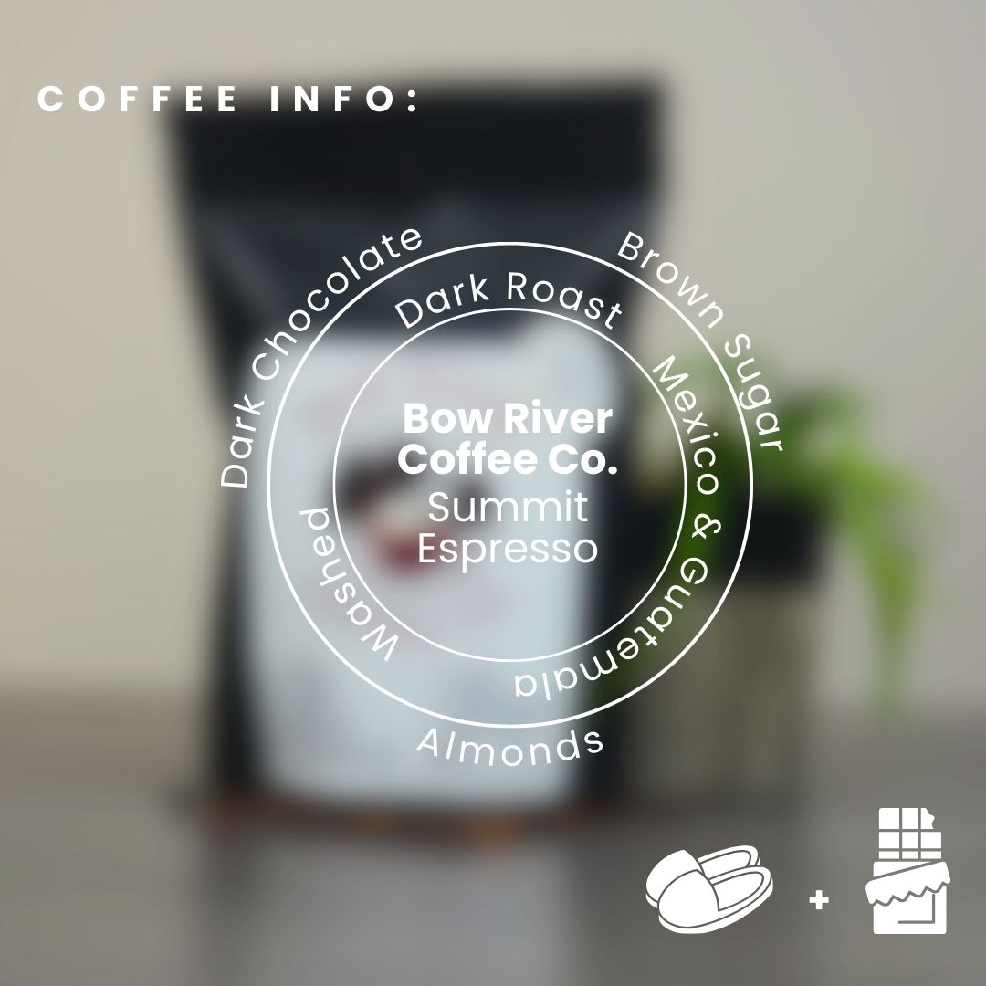 Bow River Coffee Co.’s Summit Espresso is for any coffee lover that loves a classic, Italian-style espresso. This espresso is a blend of organic Mexico and Guatemala beans. With notes of dark chocolate, brown sugar, almonds and a rich creamy finish, this coffee is a great foundation to any caffeinated creation!