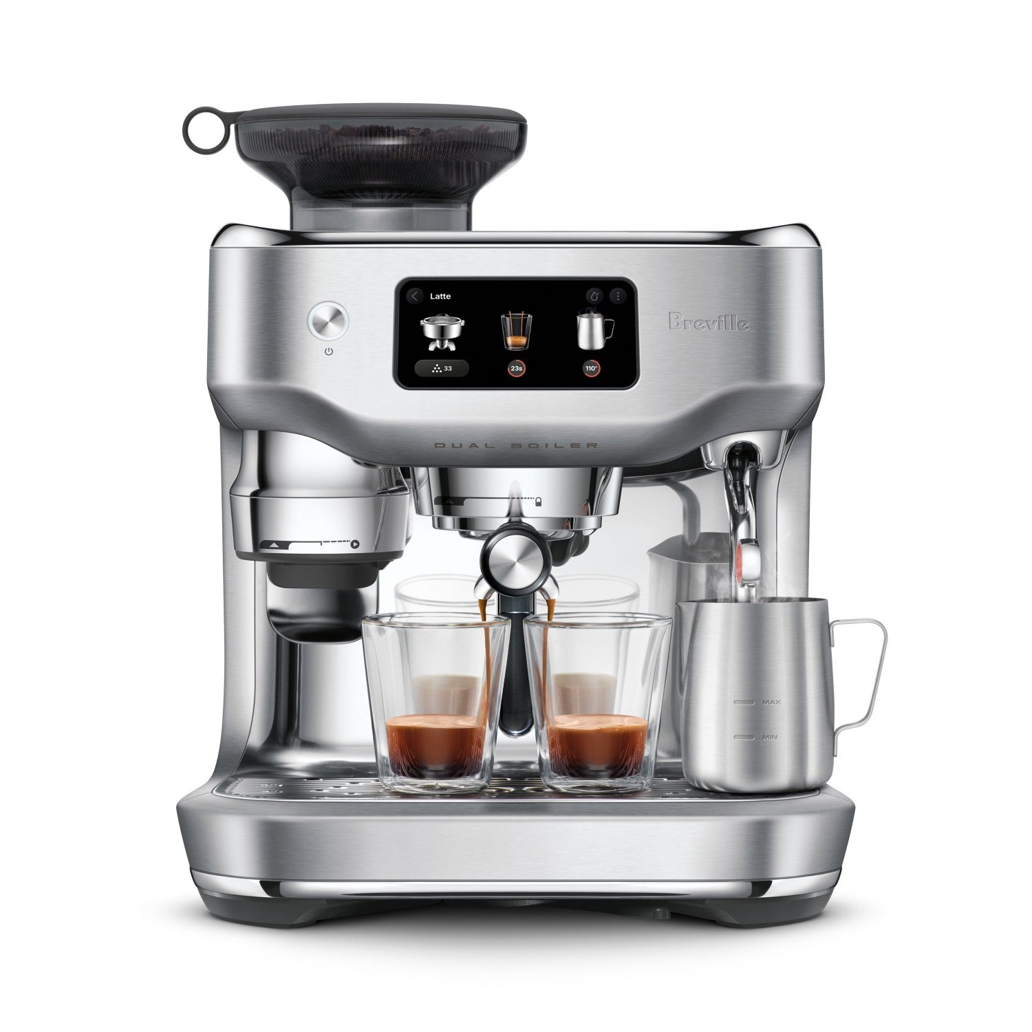 The most advanced Oracle ever, with a powerful Quad-Core CPU that enhances the highly responsive 5.7" touch screen letting you switch between two modes. Sit back and relax on Auto or take control in Manual mode. Enjoy an authentic café experience at home with powerful stainless steel dual boilers for simultaneous extraction and steaming. New Auto Dial-In system monitors each extraction and helps to improve your next espresso shot. Auto MilQ™ delivers silky microfoam hands-free, with settings optimized for dairy, soy, almond and oat. Plus, use the new Breville+ Coffee App to remotely power on and pre-heat your machine.